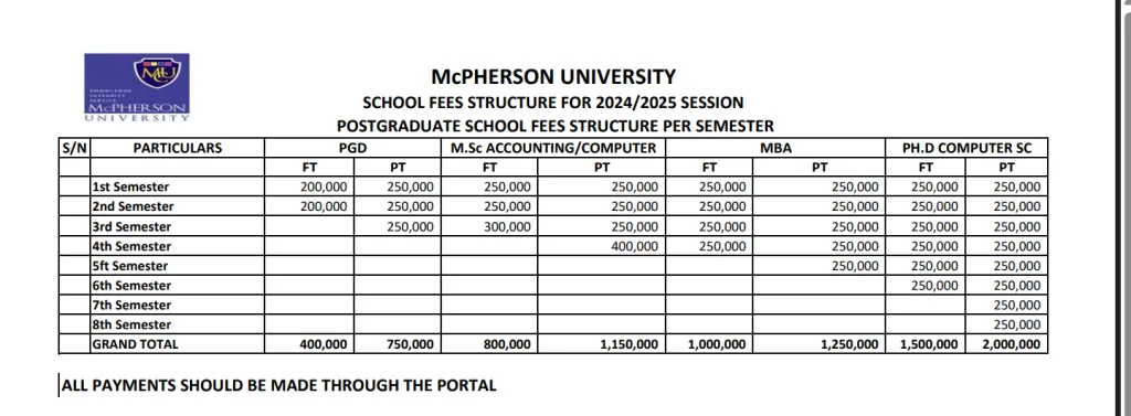 Below is the full schedule of fees breakdown for all postgraduate courses offered at the McPherson University: