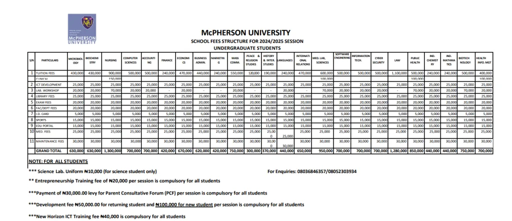 In this blog post, you will get to read about the schedule of free courses for all the undergraduate and postgraduate courses offered in McPherson University and all other important charges vital for students to pay for the 2025/2026 academic session. Let’s get into it.